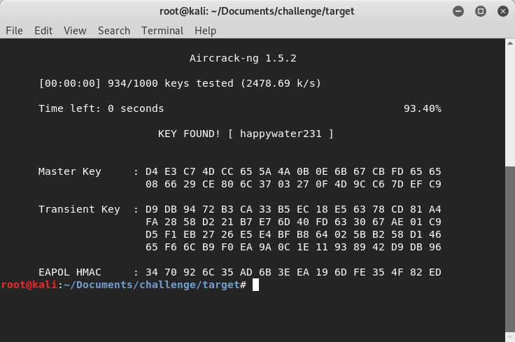 Ok time to do a little more enumeration on the Device since there are no hints into his WiFi password and utilizing common word-lists I decided to go for a know attack called key-space attack you can find some info here so I decided to find info on the router and see what are its most common “keyspaces” related to the device, after hard research and lot’s of google I finally came up with a word-list capable of cracking the device, here is a shot of success (I needed a couple days for this to happen )