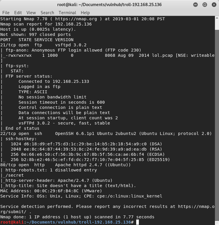 nmap -sC -sV 192.168.25.136 -oA troll-tcp