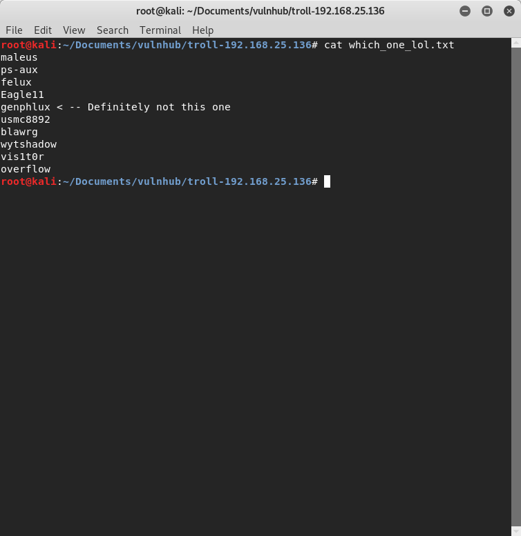 gobuster -u http://192.168.25.136/ -w /usr/share/wordlist/dirbuster/directory-2-3-medium.txt -t 50 -x php,txt -o gobuster-troll.txt
