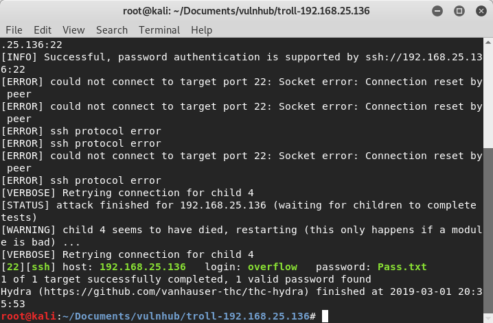 No more connection seems that the trolling here was to try every 30 seconds ,I had to wait after the time passed ,I tried again to make sure but it did not work I was thinking that probably the User or Password file was a troll in some way but the only odd one was the since it just contained something that said Good_Job:) so I knew this was a troll after some thinking I figured that the password was actually the name of the File so I tried with Hydra once againPass.txt,