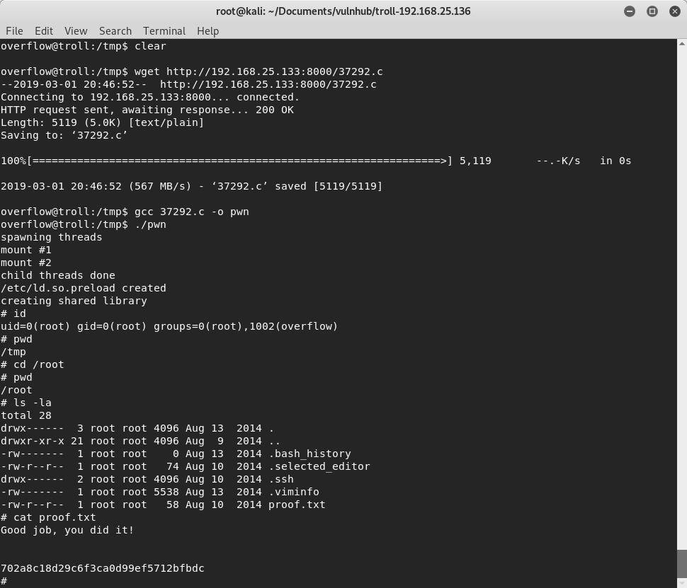 A searchsploit look up showed me that it was vulnerable to an exploit since this was a really old box so of course something had to be out there, I used my first option 37292.c, set up another python server to download the file into the box compile it and executed
