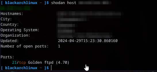 shodan search --fields ip_str,port,org,hostnames "Golden FTP"