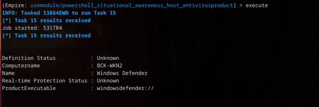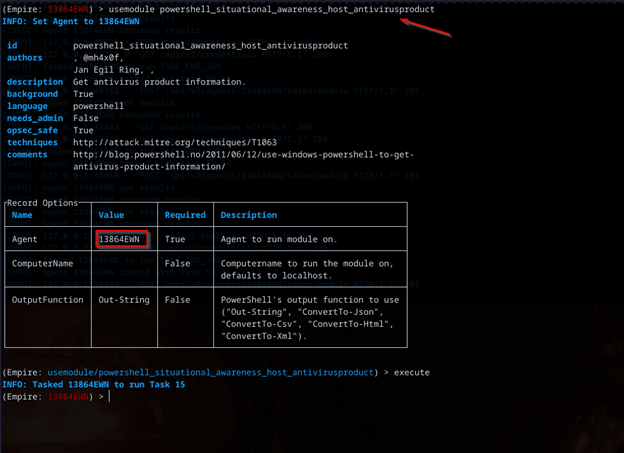 Perfect now from here we can start grabbing more info, look for potential passwords, interesting files, the whole 9 yards to grab as much as possible from the host, now some things I personally like to take a look at are processes and the security product we are going up against, Empire has modules that can be utilized to execute in memory from the current or any live agents that we have for example the antivirus module to locate the security product running: