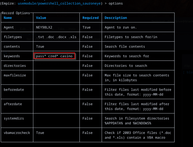 I want to also take some time to look for interesting files, processes anything that might give me an idea on what’s going on the network Empire has useful modules for this type of approach a built in SauronEye module an interesting C# tool built for fast searches built into Empire utilizing PowerShell