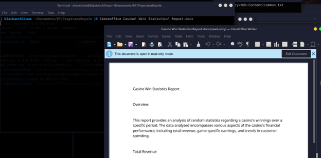 I’ve downloaded the file for analysis and just viewed a report on the Casino’s winnings since the files are within the docker you need to copy them locally [8]