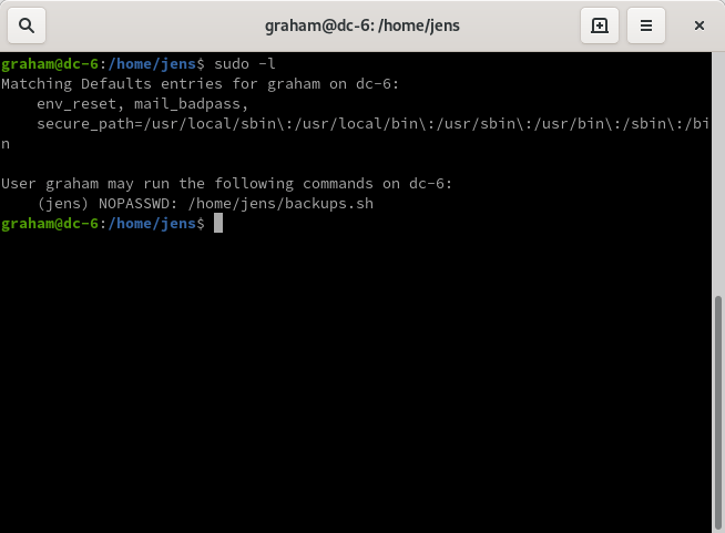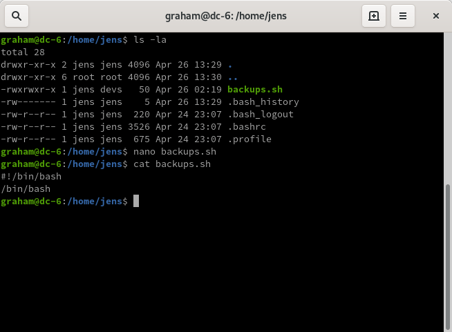 Notice that graham is part of the devs group we can edit the file found on jens directory and modify it to execute a shell