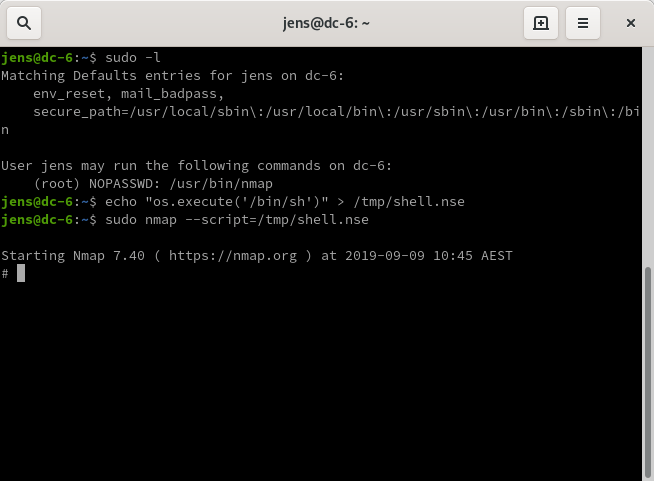 Found the nmap vulnerability to get an interactive shell with root privileges but this did not work so I will create and nse script that when executed it will return me a root shell